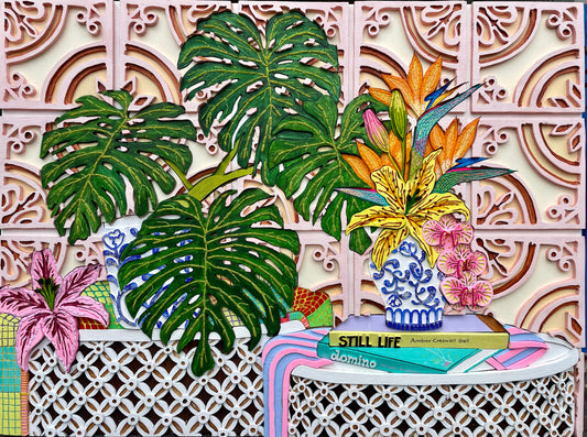 122.5 x 92.5Plywood, acrylic and embroidery on boardFramed in Tasmanian Oak This original three-dimensional woodcut...