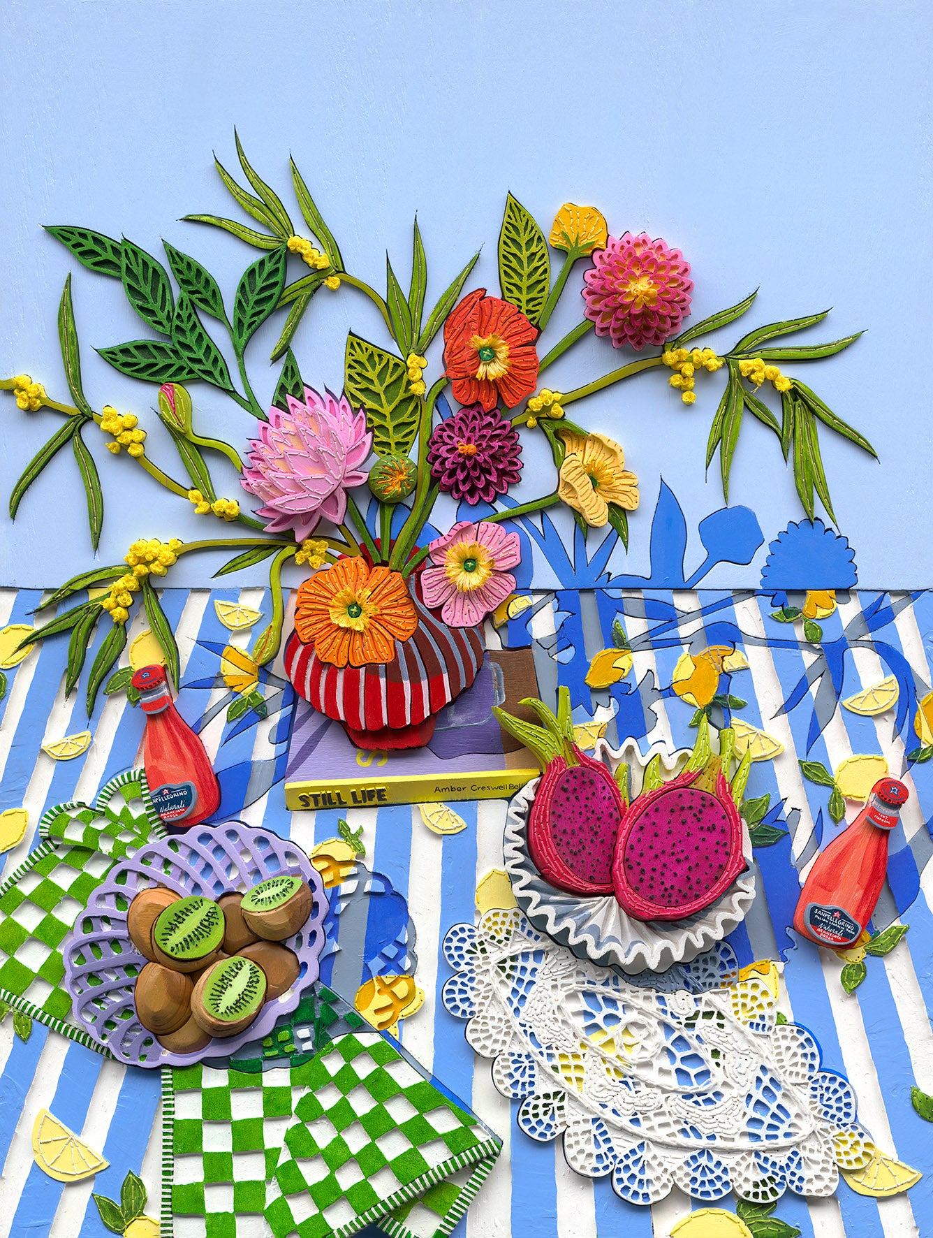 Solar Still limited edition print is a scanned reproduction of an original, three-dimensional artwork made from wood, acrylic paint and embroidery. Using cutting edge technology this archival print is the next best thing from an original woodcut artwork. Using only the highest quality materials, this print has so much detail- you can even see the fibers in the wool.